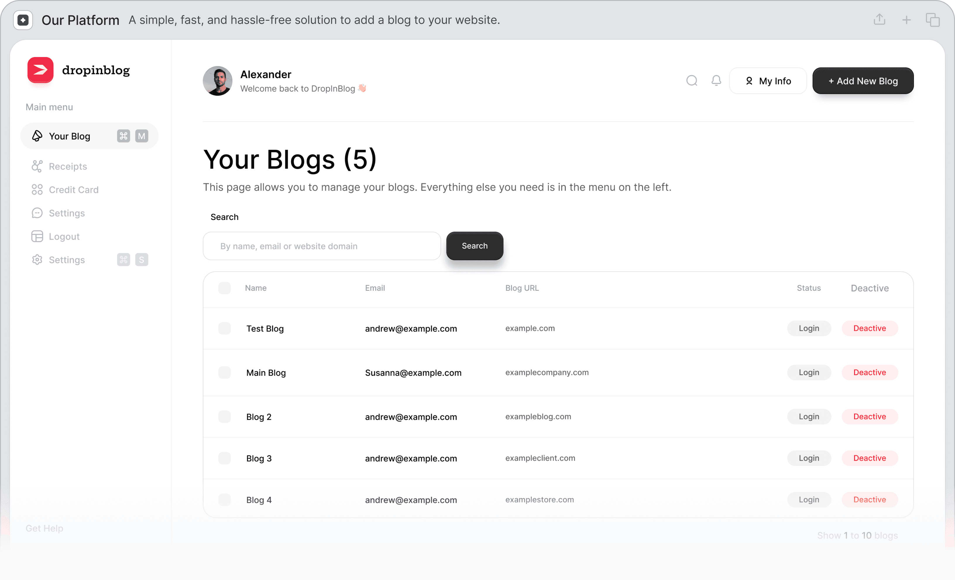 For a one-time fee, we can white-label your agency panel. This means you and your clients will see an admin panel that has your logo and runs on your subdomain. All billing goes through you, and you bill your clients. DropInBlog is your silent partner and you can resell our product as your own.