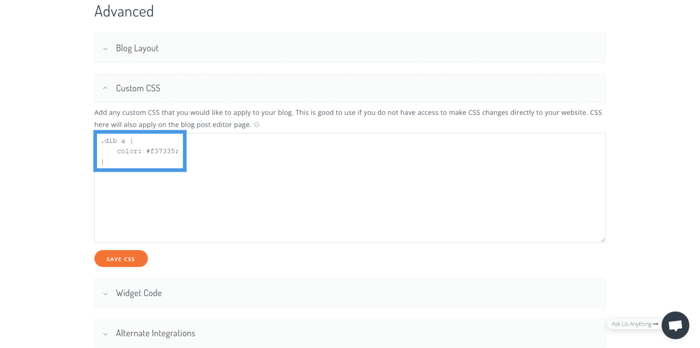 To add custom code within your DropInBlog account, you need to open the Code & Layout page – the same page that we copied the integration code from. When you scroll down, you’ll see the Advanced section. Click the Custom Code subsection, and you can write or paste your custom CSS code just like in the image above.