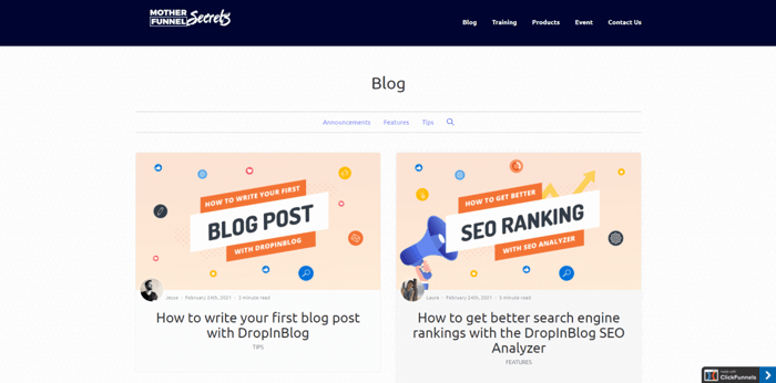 The other way you can blog on ClickFunnels is by integrating with a third-party app, like DropInBlog, the super cool and super easy-to-use blog. It doesn’t take more than a few minutes to set it up, and the benefits will become obvious as soon as you start using it.
