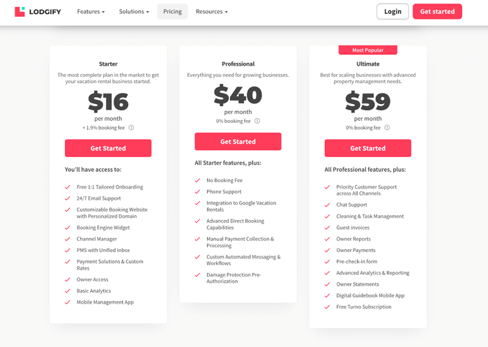Lodgify’s pricing structure is based on two factors: the number of properties you manage and the level of features you need. Pricing starts affordably for small portfolios and scales up as your business grows. Some plans include booking fees, while others waive those fees in exchange for a higher monthly rate.