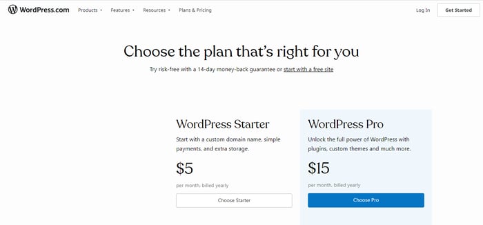 Alternatively, if you skip the DIY part and opt for WordPress.com as your hosting solution, you will get access to their own pricing plans, which recently saw a change and went from four plans to two. You can find a more detailed comparison of the plans here.